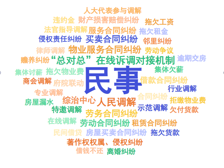 (二)多元解纷案例中“民事”“‘总对总’在线诉调对接机制”“人民调解”关键词出现频次较高