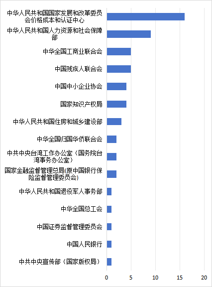 57例推荐部门为国家部委的共涉及15个机构[7],包括国家发展和改革委员会价格成本和认证中心、人力资源和社会保障部及中华全国工商业联合会等机构。其中推荐部门为国家发展和改革委员会价格成本和认证中心的最多,有16例,总占比约28%;人力资源和社会保障部有9例,总占比约16%;中国残疾人联合会和中华全国工商业联合会均有5例;国家知识产权局、中国中小企业协会等11个推荐部门的案例数量在1至4例之间。