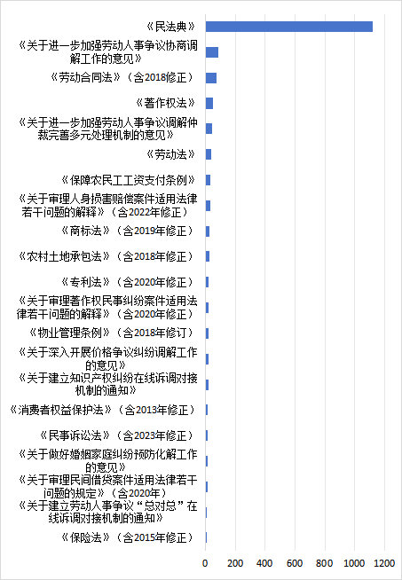 136部法律法规引用次数共计1985次,引用次数50次以上的共4部,分别是《民法典》引用1122次、《关于进一步加强劳动人事争议协商调解工作的意见》[9]引用83次、《劳动合同法》(含2018修正)引用73次及《著作权法》引用50次;引用次数30次至50次之间的有4部,包括《关于进一步加强劳动人事争议调解仲裁完善多元处理机制的意见》[10]引用42次、《劳动法》(含2018年修正)引用35次、《保障农民工工资支付条例》引用33次及《关于审理人身损害赔偿案件适用法律若干问题的解释》(含2022年修正)引用31次。引用次数10次至30次之间的有13部,包括《关于深入开展价格争议纠纷调解工作的意见》[11]、《关于建立知识产权纠纷在线诉调对接机制的通知》[12]、《关于做好婚姻家庭纠纷预防化解工作的意见》[13]及《关于建立劳动人事争议“总对总”在线诉调对接机制的通知》[14]等。115部引用次数均在10次以下。