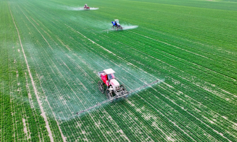 2024年2月18日,安徽省亳州市利辛县纪王场乡孙老家村麦田,农民驾驶自走式高杆喷雾机对小麦进行喷药作业。