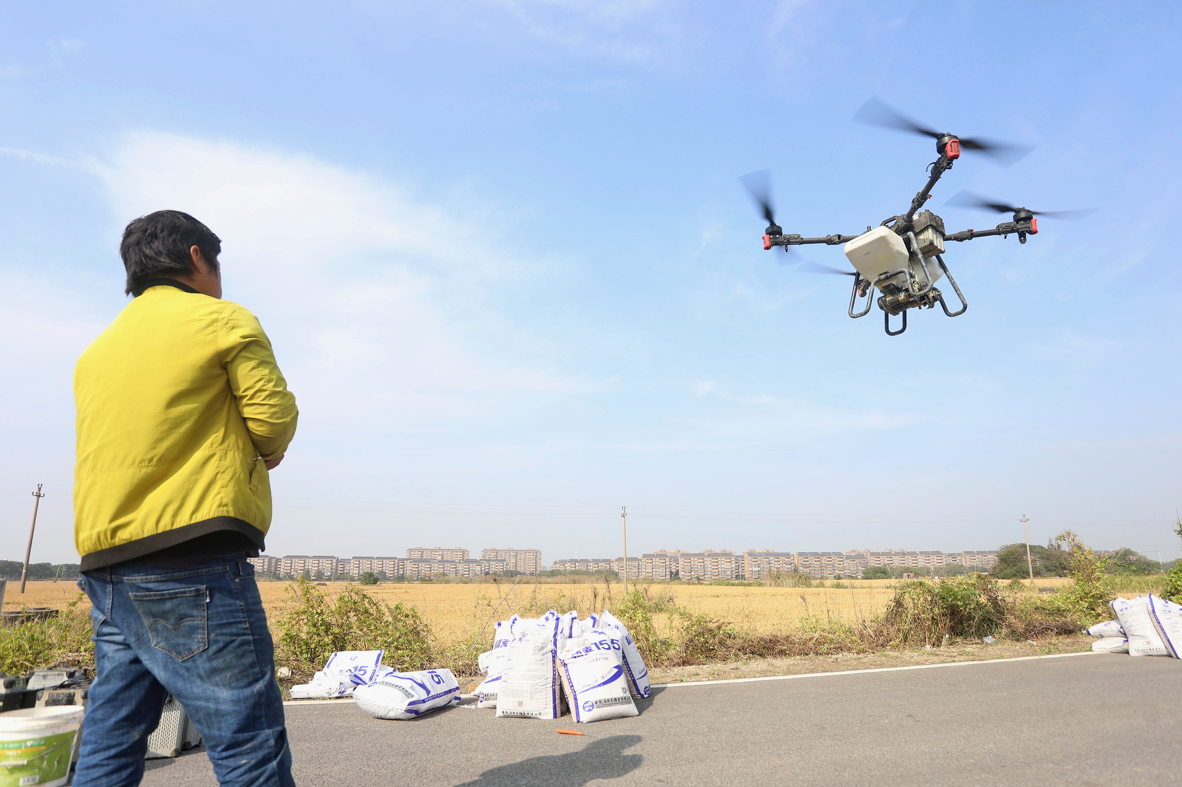2023年11月15日,浙江嘉兴南湖区七星街道一处农田里,农民操纵无人机进行冬小麦飞播。